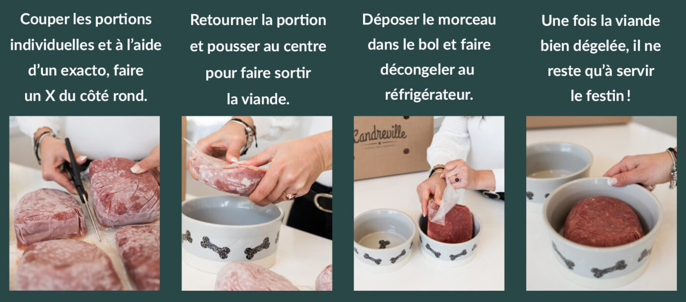 Toujours conserver la viande au congélateur. Au besoin, faire décongeler la portion voulue dans un bol au réfrigérateur. *** Il est important de ne pas laisser la portion dans l’emballage sous vide. *** Réfrigérer les portions inutilisées. Les aliments crus doivent être consommés au plus tard 3 jours après la décongélation. Manipuler le moins possible la viande crue avec vos mains. Référez-vous à notre guide d’ouverture de l’emballage. Respectez les règles d’hygiène en nettoyant toutes les surfaces et le matériel utilisé avec du savon et de l’eau chaude. Ne pas faire cuire la viande, car elle contient des os broyés. *** Non destiné à la consommation humaine. ***